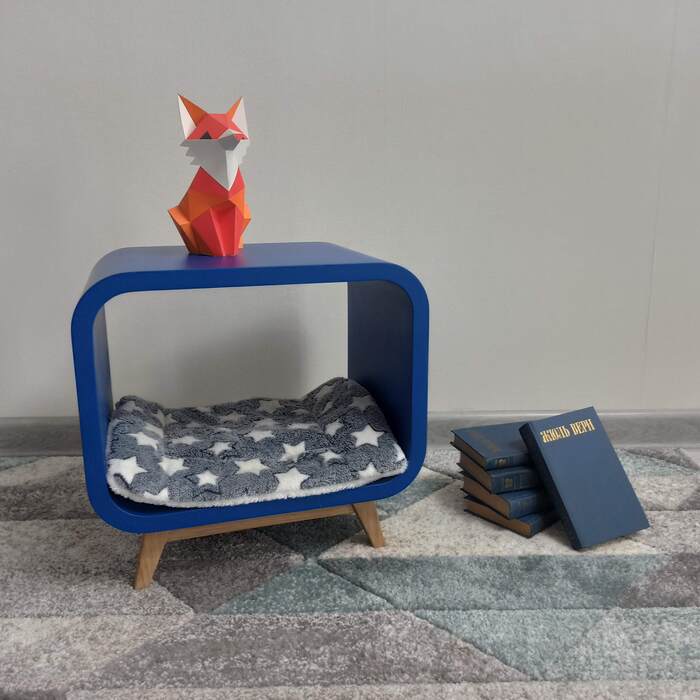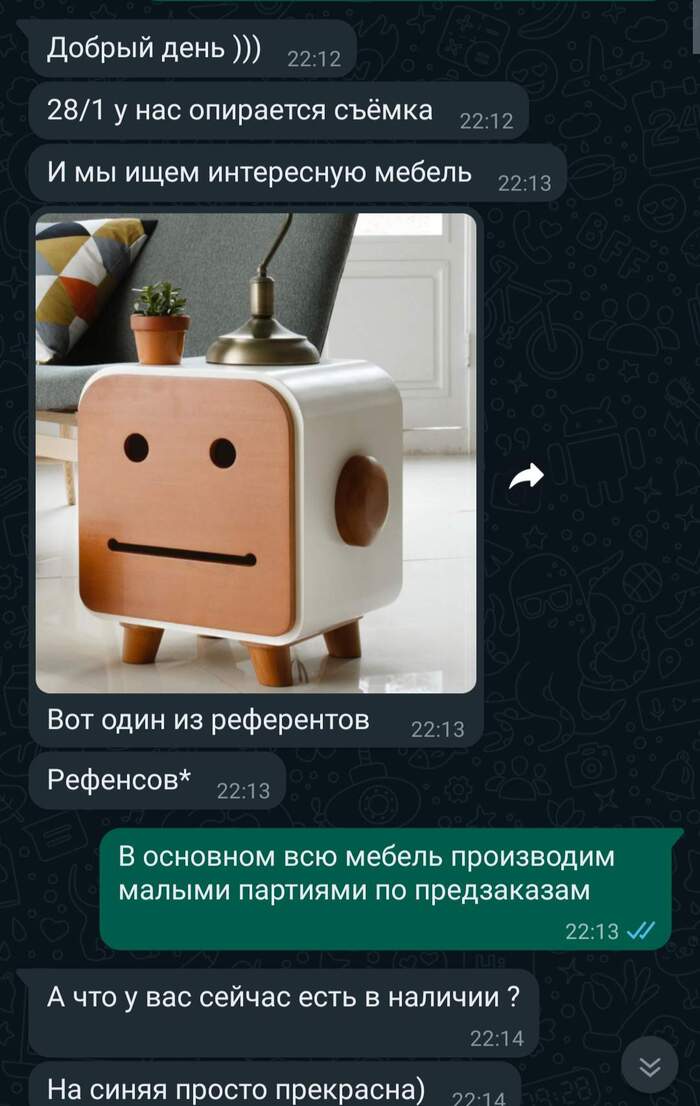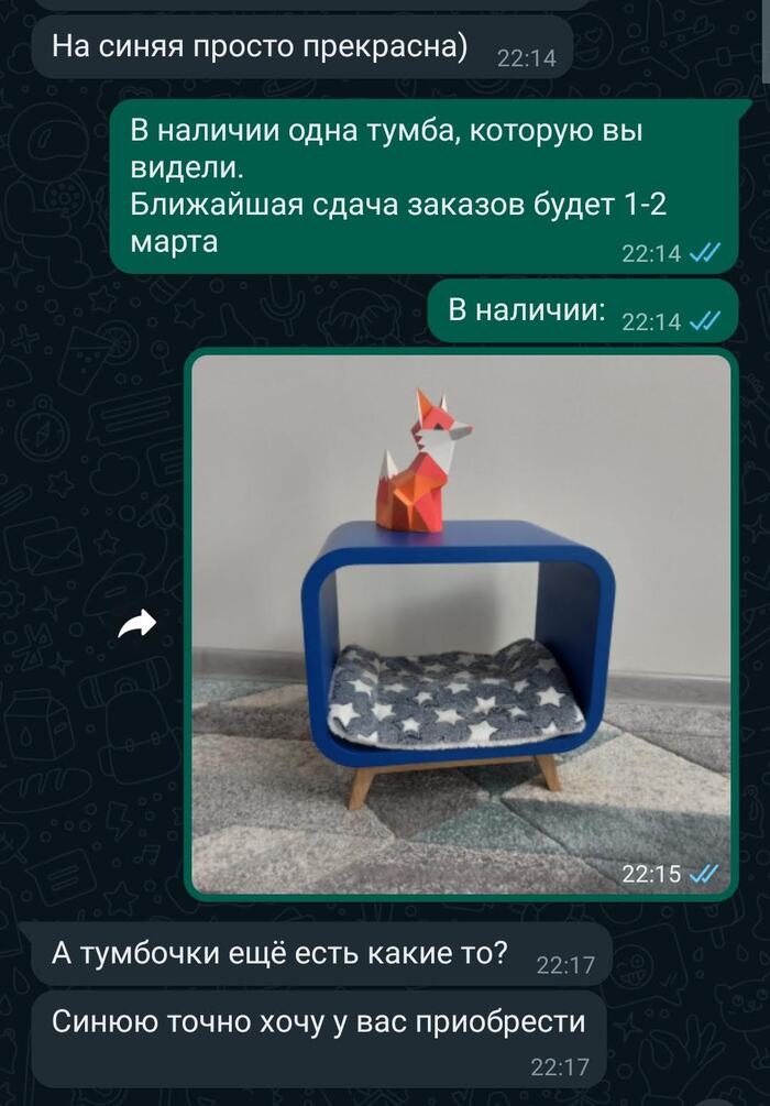 Честно говоря, я немного приукрасил. В тот момент малыми партиями я мебель не производил, только индивидуальные заказы. В любом, хоть несколько изделий и должно было быть готово в конце недели, но на руках у меня была только эта синяя тумба. К счастью, девушку она устроила.