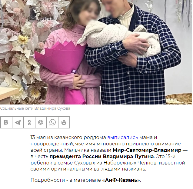 "Мир-Святомир-Владимир. Именно так назвали своего сына многодетные родители из Набережных Челнов. Мальчик появился на свет 7 апреля, став пятнадцатым ребёнком в семье Владимира Сухова. А имя своё он получил в честь — как подчёркивает отец — «мира, добра и великой России».
