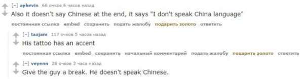 В треде нашлись те, кто уверяет, что парень сделал тату об ошибках с ошибками. В ветке обсуждения началась дискуссия по поводу штриха в одном из иероглифов, которые использовал автор. Приводить её мы, конечно же, не будем, но вынесем один из самых понятных для чтения моментов.