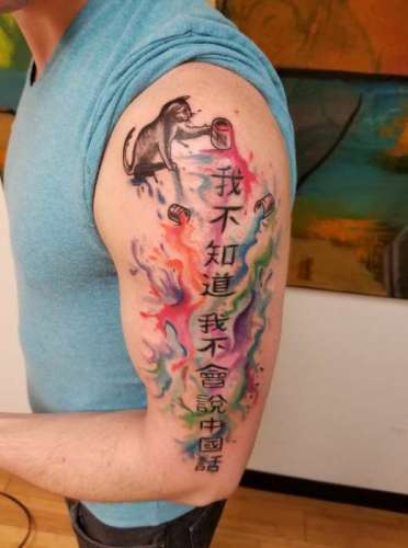 Парень придумал идеальный ответ для тех, кто интересуется значением татуировок. Он набил на своём плече иероглифы, которые переводятся так: «Я не знаю, я не говорю по-китайски». Но есть мнение, что в этой простой фразе он сделал ошибку.