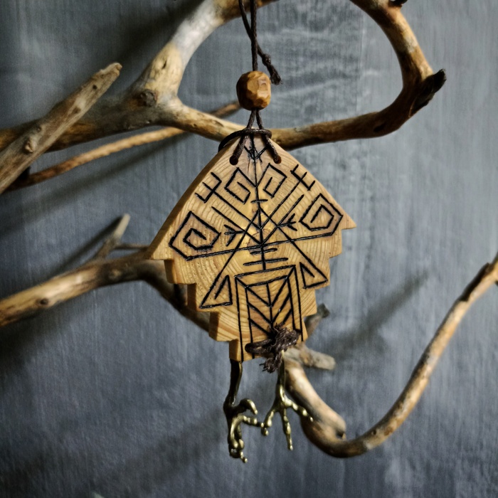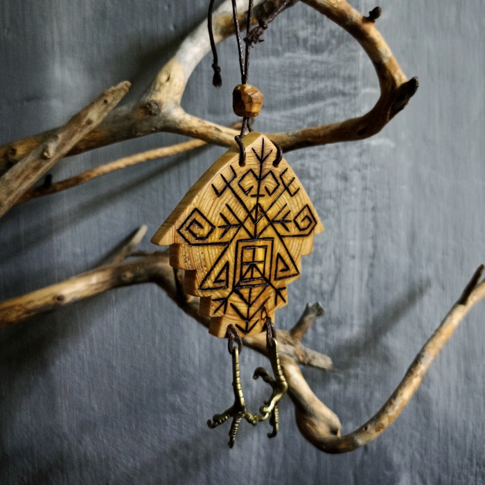 Избушка - декоративная подвеска, вырезана из спила сосны. Узоры нанесены с помощью пирографии. Также использованы бусины из вишни, вощёный шнур и лапки из неведомого металла. Обработана масловоском.
