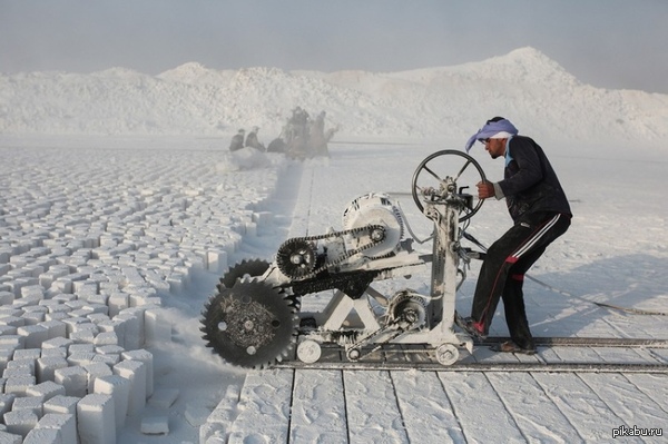 Есть некий острый инструмент, которым нужно попасть в раскол между пластами. При необходимости инструмент подбивается кувалдой. Когда хороший кусок породы отломился, он забирается обыкновенной лопатой или даже руками. Так как на картинке - месторождение в Псковской области, конкретно там вся добыча производится исключительно вручную. Никакой экскаватор или любой другой механизм не сможет точно попасть в раскол между пластами залегания, не обеспечит достойный размер добытого куска, а только всё переломает.