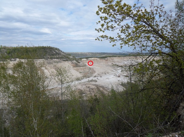 Проехав на середину карьера (где умудрилась навернуться, попав колесом в колею ХDD) осознала насколько высоко находилась пока снимала видео. место съемки - красный кружок)