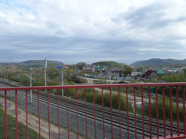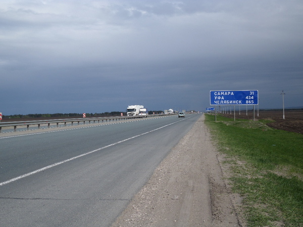 Проехав какое-то расстояние я таки попала на м-5. Это самое любимое место на всей поездке, из-за участка в 30-40 км, идущего под уклоном и все это время педали крутить вообще не приходится, только едешь, да видами любуешься))) Но не сегодня( набежали тучи и из-за сильного встречного ветра мне пришлось не только крутить педали, но и спускаясь со склона я ехала так, будто поднимаюсь. А уж когда приходилось подниматься на склон, это был кошмар какой-то. Сфотала тучи и знак, говорящий, что мучиться мне осталось всего немного.