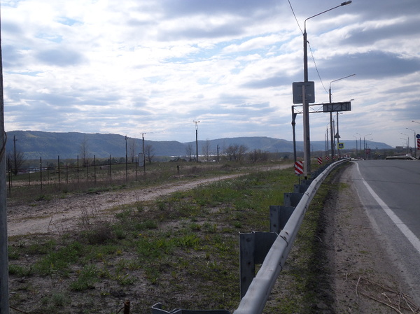 Сделав фото, поехала дальше. На тот момент было пройдено уже около 50 км, по каким-то причинам моя задница дико саднила, а ноги уже давно прекратили спрашивать, какого здесь происходит и приступили к угрозам, что если все это не закончится, то мне же будет хуже. Но деваться некуда( Зато, проехав Волжский и поднявшись по трассе наверх, я увидела очень крутой вид на горы - Лысая гора, Царев курган и сами Жигулевские горы. Надеюсь, на фото передадутся все цвета, которые были в реальности.