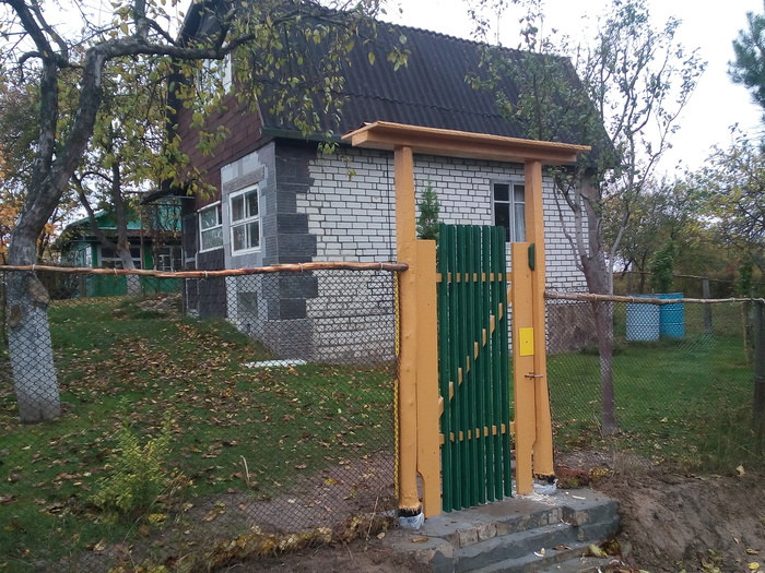 Даче более 30 лет. Едва ли не каждый сезон мне приходилось ремонтировать забор, который 20 лет назад я раздобыл устроившись на пилораму - случай с рабовладельческой организацией труда неслыханный! Чуть позже бежал от туда по добру поздорову. И вот, настал такой момент, когда ремонтировать уже, собственно, было нечего - ветхий забор пришёл в негодность. Решил отказаться от пережитков прошлого и заменить сплошной забор сеткой, которую едва успел отрыть с рубежей садового товарищества, пока она с завалившимися столбиками не поросла травой, всё таки 30 лет прошло. Первым делом соорудил новую калитку. Получилось неплохо! Самое главное, украсть то пришлось всего ничего: весной бревно для косяков и притолоки, потом, уже перед самой работой, смородёрничать для фундамента кирпича на пожарище - получилось, конечно, дёшево, но с большой нервотрёпкой, потому что всякий раз приходилось доказывать досужим свидетелям, крайнюю необходимость материала; на дверь пошли строительные леса с коттеджей; петли, конечно, пришлось покупать - какое же удовольствие купить не то что как-то можно приспособить, а именно то что нужно!; саморезы - по моему, у продавца не совсем хорошо с математикой и рейки, декоративного назначения - прекрасный пиломатериал от московских поставщиков, в отличии от местного производителя. На основную работу ушло три дня, остались лишь мелкие недоделки. Три дня перебивался сухим пайком. С погодой повезло - уже холодно, но солнечно. (с)