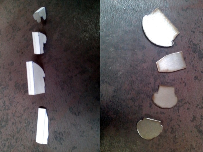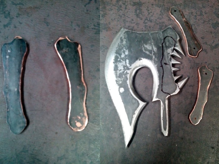 Делаем верхние пластины из нержавеющей стали 40Х13 методом холодной ковки. Вырезаем шаблоны из бумаги, выпиливаем заготовки придаем им нужную нам форму: