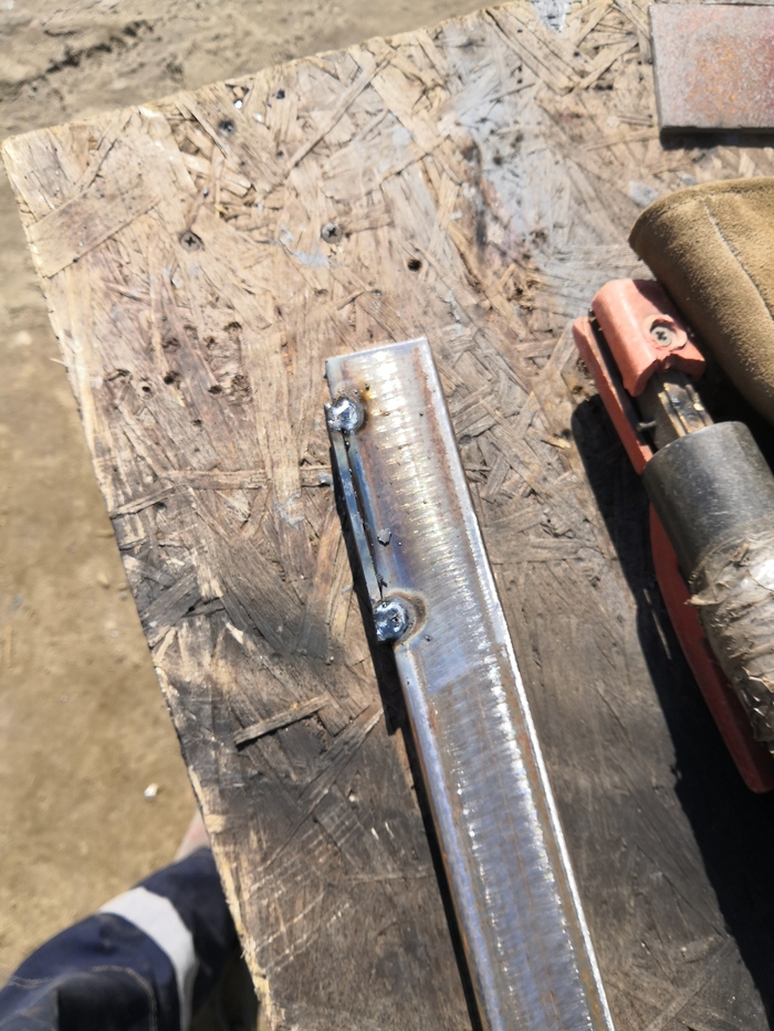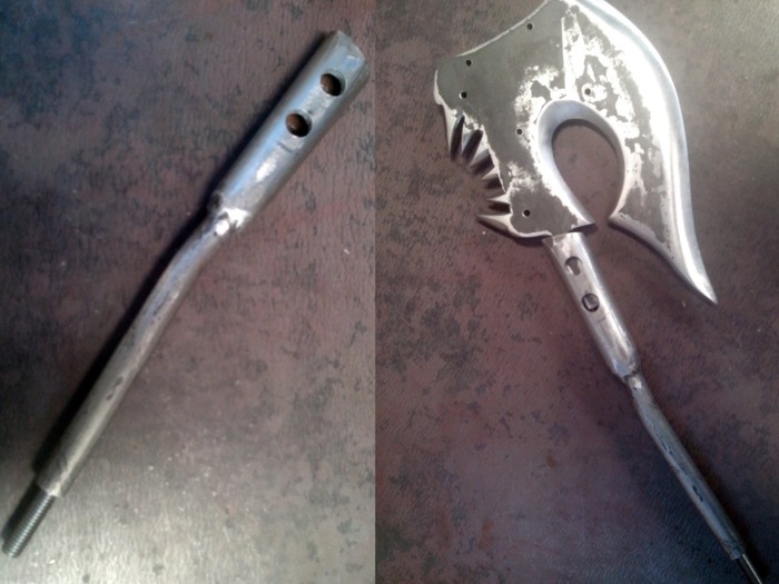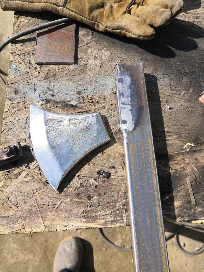 Вначале думал как положено, с деревянным топорищем, но передумал, взял трубу 20*40, предварительно усилив пластиной в месте скрепления.
