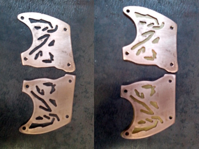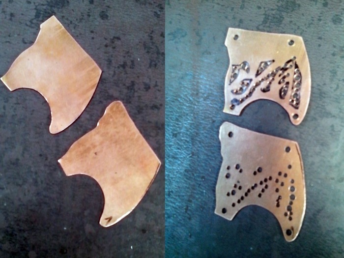 Берём пластины меди и латуни и делаем боковые накладки с узором. Насверливаем отверстия в узоре о пропиливаем все надфилями:
