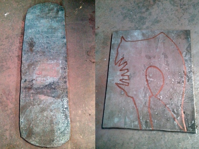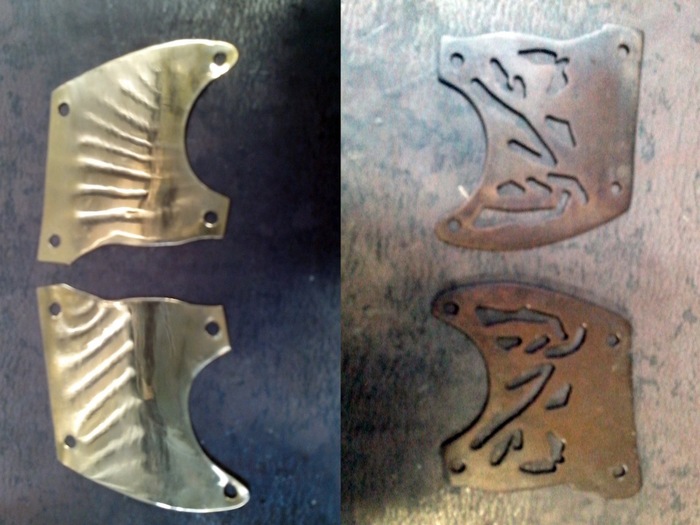 Далее берем пластину откованной меди и вырезаем задние накладки:
