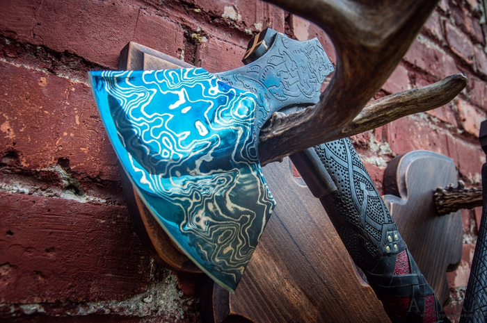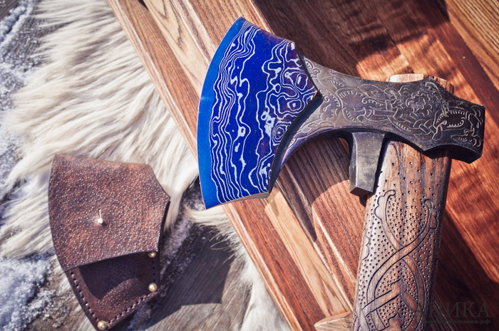 Чтобы топор стал поинтереснее, попараднее, наварили на щеки дамаск и решили оксидировать (термо-химический процесс, в ходе которого верхний слой стали окисляется и становится синим, фиолетовым, либо черным). Но топору все еще чего-то не хватало, и пару дней художники подозрительно косились на поковку, не зная, что из нее вылепить, куда ее вести дальше.