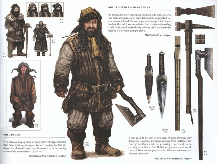 Для каждого гнома Weta Workshop создали индивидуальный набор инструментов, от боевых до бытовых. Дизайнеры говорят, что основной задачей было сохранить единый стиль и то самое ощущение «гномости». Частично стиль уже задали художники, работавшие над Гимли во Властелине колец. Так что думая над внешним видом и предметами для компании Торина Дубощита, дизайнеры ставили себе задачу, чтобы зритель, уже знакомый с Гимли, точно узнавал в персонажах представителя его народа, но при этом мог бы легко отличить и самого Гимли, и гномов внутри отряда.