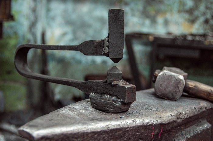 Это не потому, что мы в детстве котов не мучили, это потому, что голове топора нужно на чем-то держаться. Усы – это вот эти длинные вытянутые линии, идущие вниз от головы. Обычно такие элементы приваривают электрической сваркой, это куда проще и удобнее. Но мы оттягивали их вручную из цельного куска стали. Во-первых, так надежнее. Во-вторых, хотелось добиться аутентичности не только во внешнем виде, но и в процессе работы. Вряд ли дети Дурина орудовали сварочными аппаратами. Значит, и нам не подойдет все, что невозможно создать ковкой.