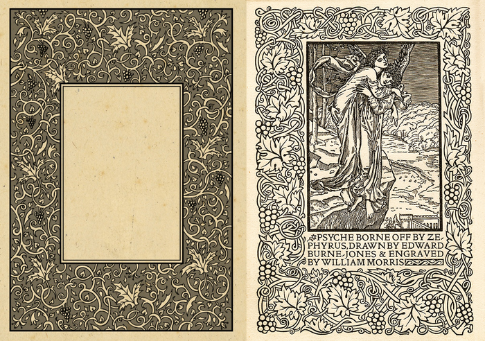 Например вот этот макет "пустой" страницы титула слева от шмуцтитула был выполнен грифельным карандашом. B нем изложена вспомогательная информация о мире Готамерона. Тyт я почти ничего не придумывал. Вдохновением к его созданию послужили орнаменты английского дизайнера Уильяма Морриса разработанные для сборника произведений Джеффри Чосера (1896).