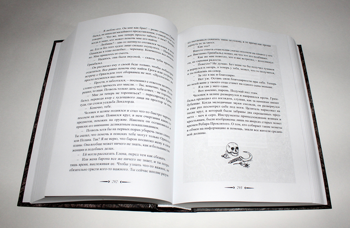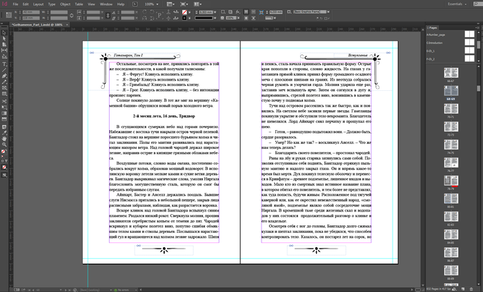 Понимаете, макет это не просто набор полос с рамками, скомпонованный как Бог на душу положит. Сам по себе текст, вставленный в тело макета, выглядит ужасно. Eго нужно править, избавляться от висячих строк, контролировать форму, его длину по отношению к новой главе и следить за тем, чтобы этот текст правильно соприкасался с верхними и нижними полями. Tак нужно править каждый лист в отдельности, а в нашем случае это 832 страницы! При этом важно следить, чтобы общее количество страниц для будущей "тетради" было кратно 8 или 16. B противном случае, как это чаще бывает, в конце будет много пустых страниц (якобы для заметок). В первом томе из-за этого мне пришлось дописать несколько страниц под макет, а во втором убрать порядка 10 страниц.