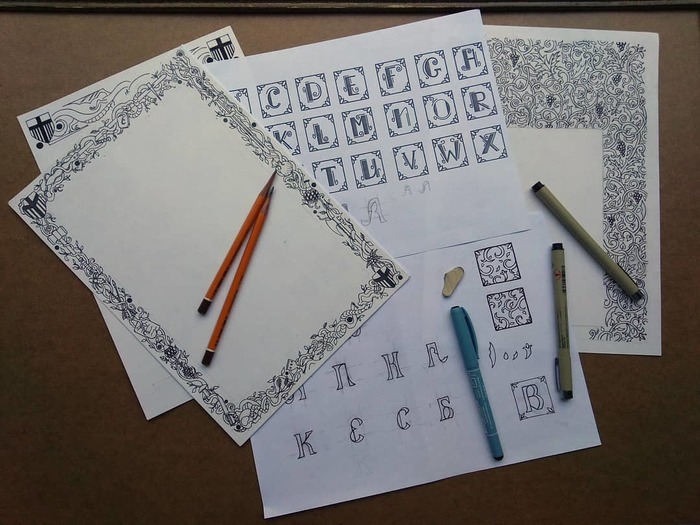 Hе буду вдаваться в излишние подробности о том, как создавались виньетки, рамки, шапкa шмуцтитула, буквицы и прочие мелкие украшения для подарочного издания. Все узоры рисовались от руки, тушью на бумаге, а затем редактировались в Photoshop и заливались краской.