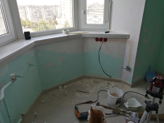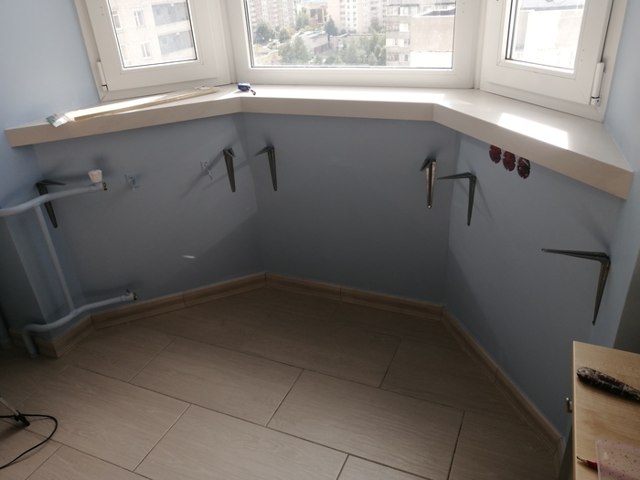 Подоконник в труху, демонтирую без сожаления. Проблема в том, что подоконник установлен в эркерную часть окон. И сделать так, что бы три части подоконника были в уровне, и нормально сопряжены не так просто. И вариантов не так много. Сделать подоконник из искусственного камня что бы можно было пользоваться и какая то эстетика была, запросили 40 тыс. и только тогда начинают думать, надо ли им со мной связываться. Поставить столешню как на кухне и соединить , что бы не было видно шва, как вариант. Но, все кто занимается кухнями-заняты на пол года. Не стандартную работу брать не хотят. И сказали сразу, что цена не будет равна стоимости материала однозначно, и проще заказать из искусственного камня. Из дерева, вообще, никто не захотел даже разговаривать. Доски пилим, типа- сам укладывай как хочешь, предоплата 100% вперед, ждать не известно сколько, не мешай, мы заняты... Важно даже не то, кто изготовит, а кто установит. Обычно те кто делают, не ставят, а кто ставит, не занимаются производством. В общем- эта работа творческая, за творчество нужно платить и самое главное, нужно найти кому. А таких личностей найти мне не удалось по быстрому. Поэтому использую стандартный набор - свои руки и имеющиеся навыки лепить из того, что было. Жена, обеспечивает моральную поддержку, и главный критик-согласовала концепцию и цвета.