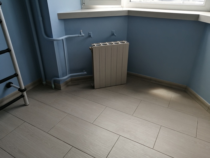 Батарея в цвет плитки на полу. Она остается на своем месте.