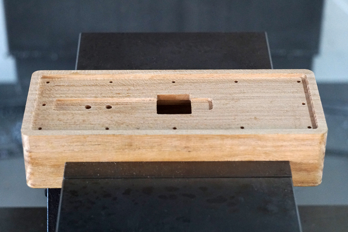 Спереди я сделал выборку под лицевую панель из алюминия и паз под затвор, а также разные крепёжные отверстия, о которых чуть далее.