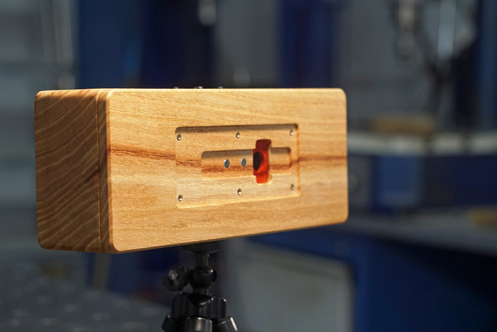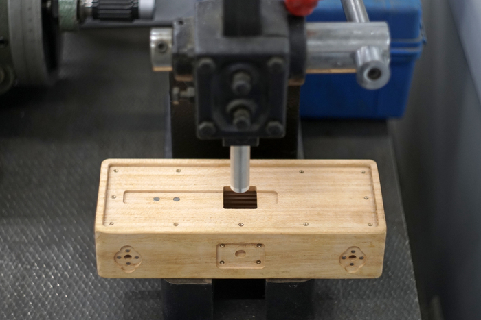 В качестве основы для корпуса я взял брусок гледичии и отфрезеровал его на ЧПУ. По бокам можно увидеть места под катушки с плёнкой, в центре - выборка под кадровое окно. Да, стоит отметить, что соотношение сторон кадра я выбрал нестандартное, так как камера будет панорамной формата 6х12 под плёнку 120 типа.