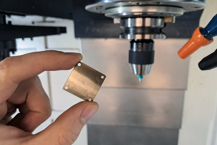 Настало время самой важной части камеры - отверстия, через которое будет проходить свет. Есть определённые формулы, по которым рассчитывается его идеальный размер для той или иной камеры и в моём случае мне нужно было получить отверстие 0.3мм. Чем тоньше материал, тем лучше, у меня под рукой был лист нейзильбера толщиной 0.05мм. Пластинку я вырезал лазером, само отверстие сделал сверлом для печатных плат. Пробовал делать лазером и отверстие, но так и не смог получить ровные края. В большинстве случаев при изготовлении подобных камер отверстие делается булавкой (отсюда и название - пинхол, то есть "булавочный укол") и в принципе этого достаточно для хорошего результата, хотя в случае с пинхолом абсолютно любой результат - хороший)