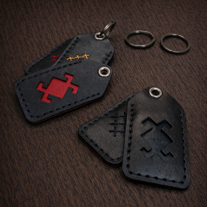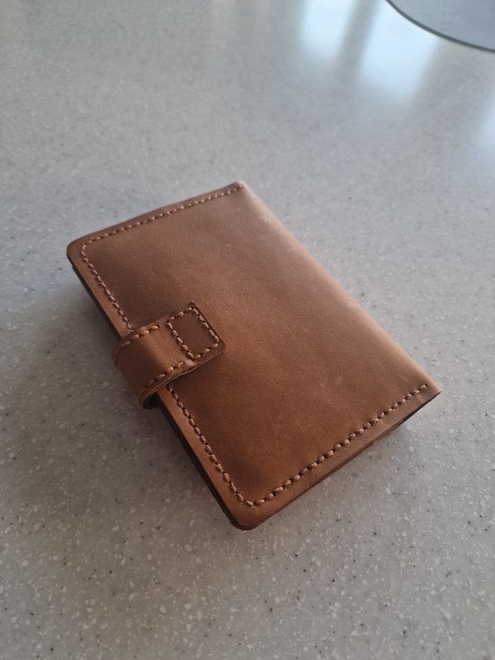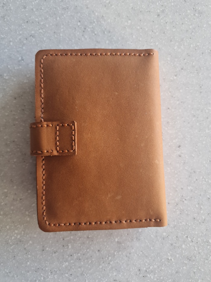 Кожа какой то краст, урезы не обработаны, нить какая то крепкая тонкая синтетика, ремешок попавшийся под руку, ключ от домофона между двумя слоями вшит, отверстия без пробойника делались по тетрадному листу в клеточку шилом. Тут 4 куска кожи, в продаже такого формата ключницы из двух кусочков которые превращаются в тряпочку со временем. В итоге ключи полностью внутри, сидят плотно, а самый большой плюс отсутствия кнопок и замков это то что её можно просто встряхнуть одной рукой и все ключи в доступе.