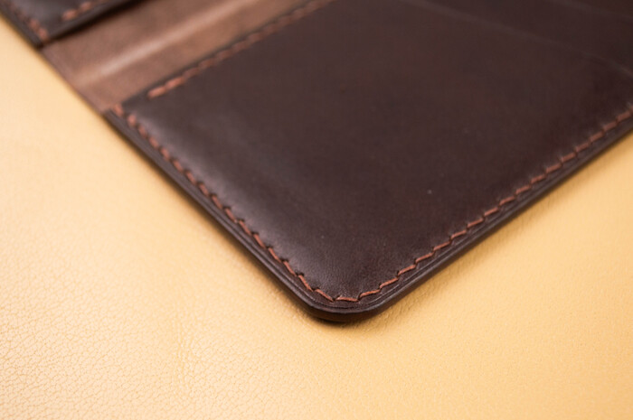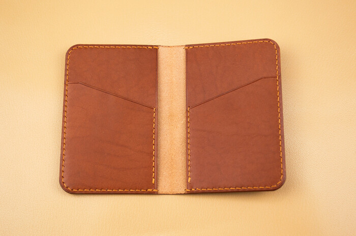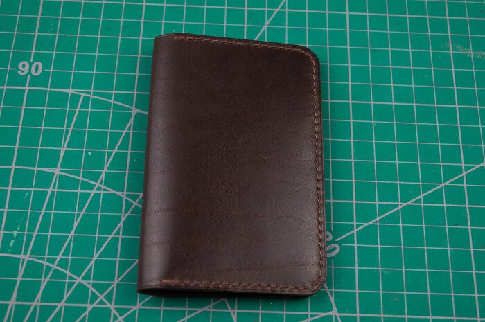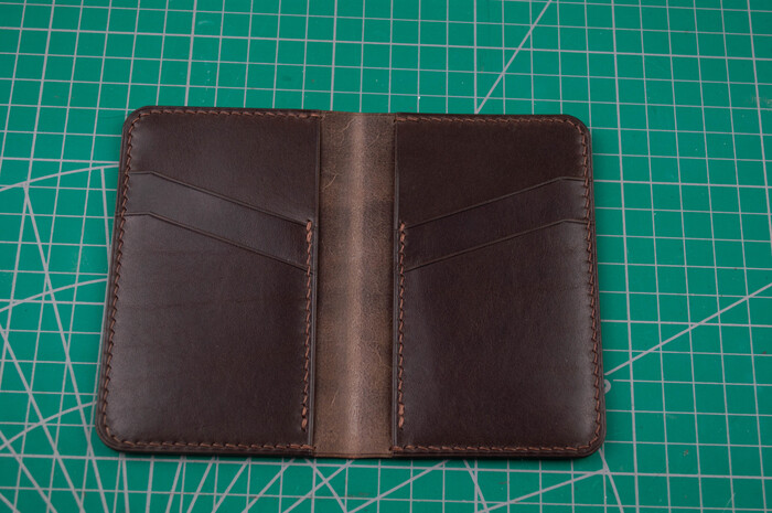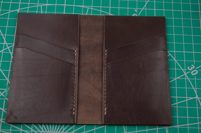 Здесь чуть более заметно выпирание внутренних карманов, но это решается формовкой уже готового изделия, да и карта в нижнем кармане всё это закроет.