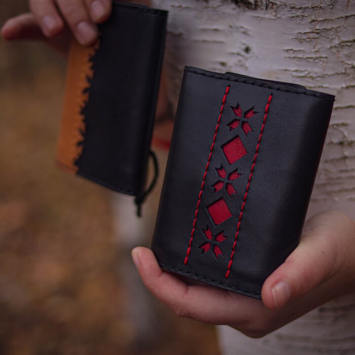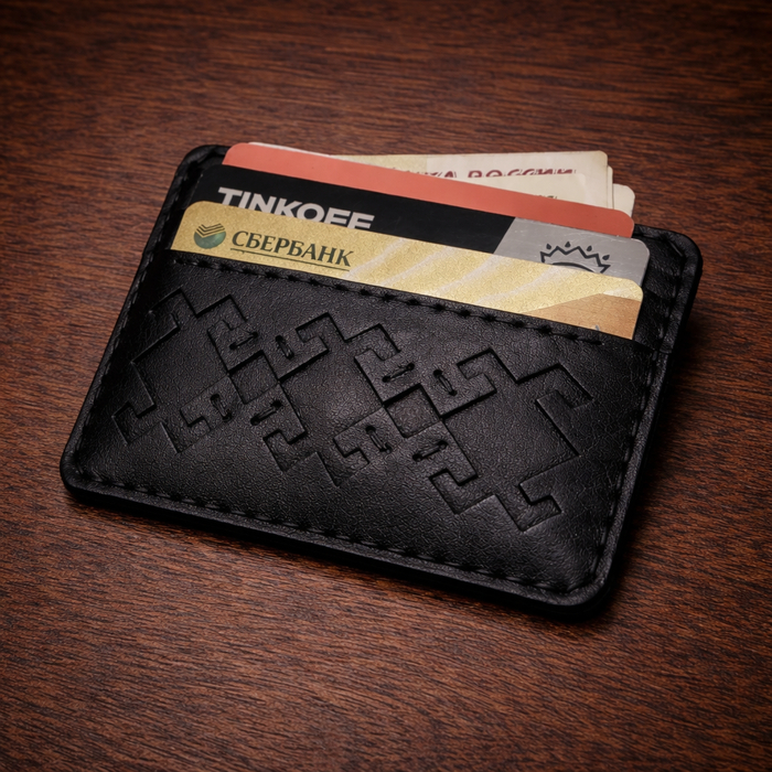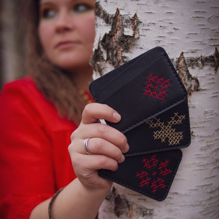 На картхолдерах один из самых популярных удмуртских орнаментов, лось и солярная звезда