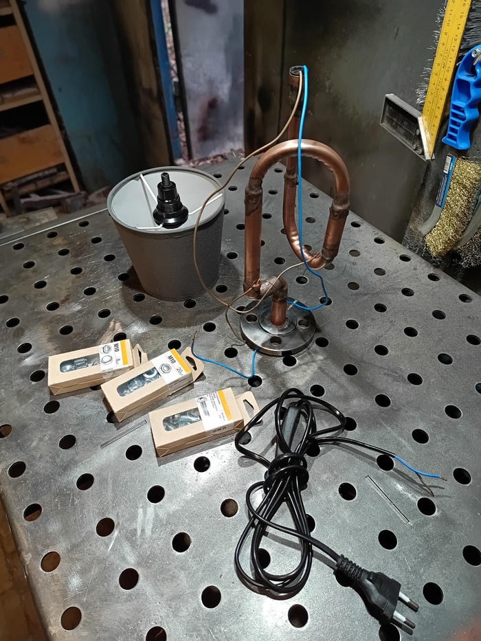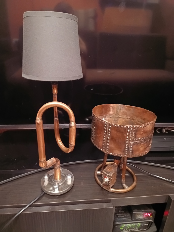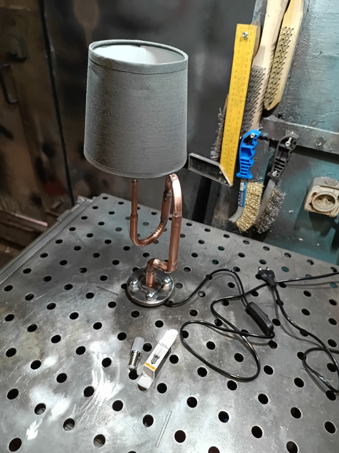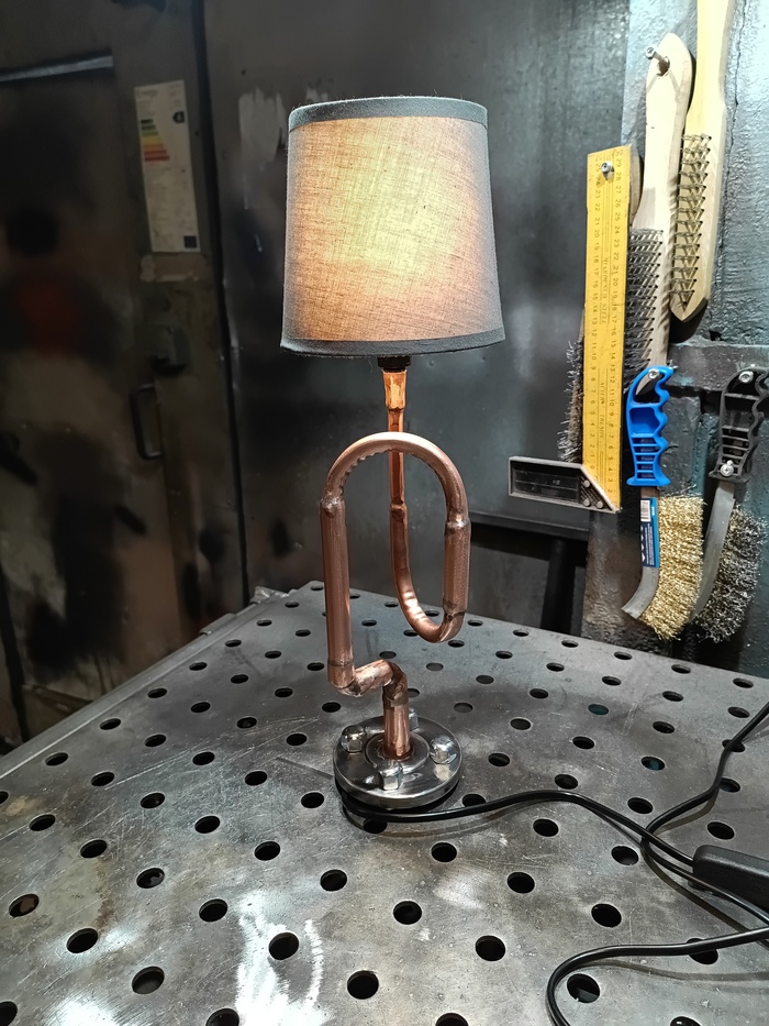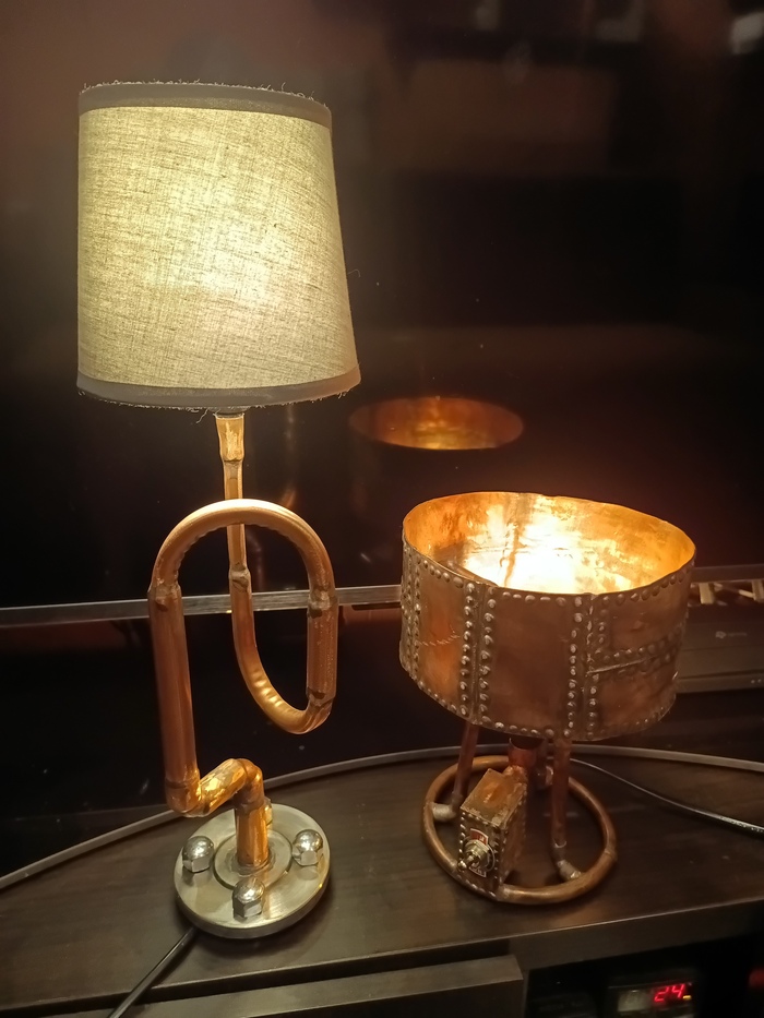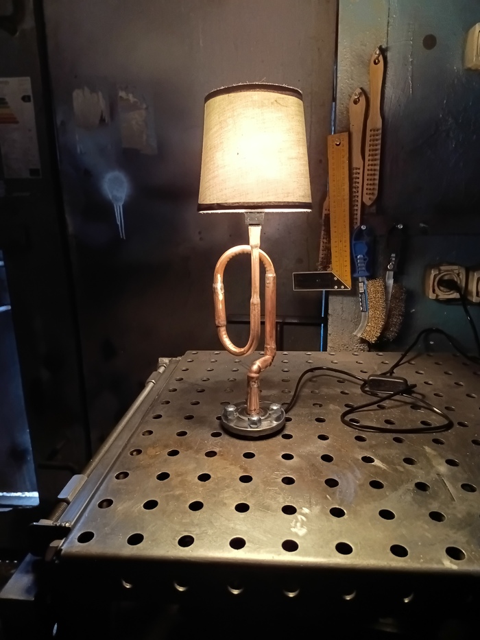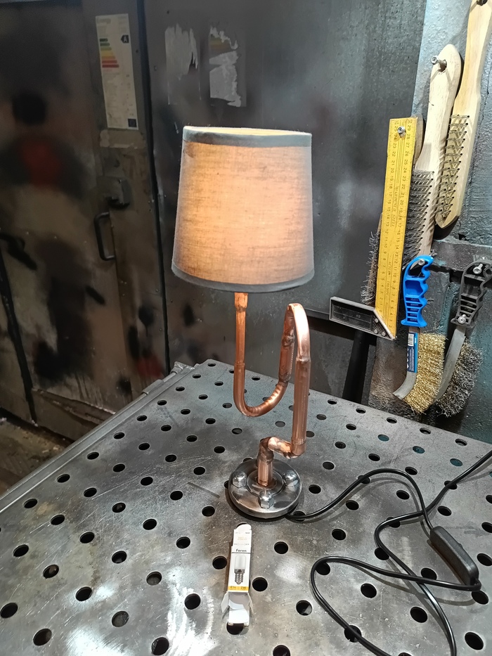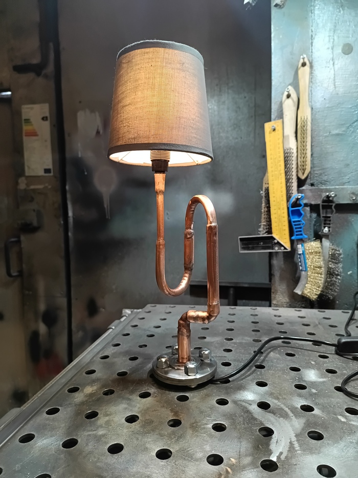 Второй торшерчик-ночник собирал опять из обрезков трубы от демонтажей, уже показывал это здесь: https://pikabu.ru/story/med_v_2d_13593585?utm_source=linkshare&utm_medium=sharing