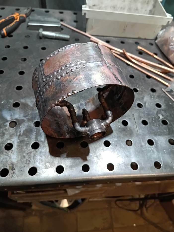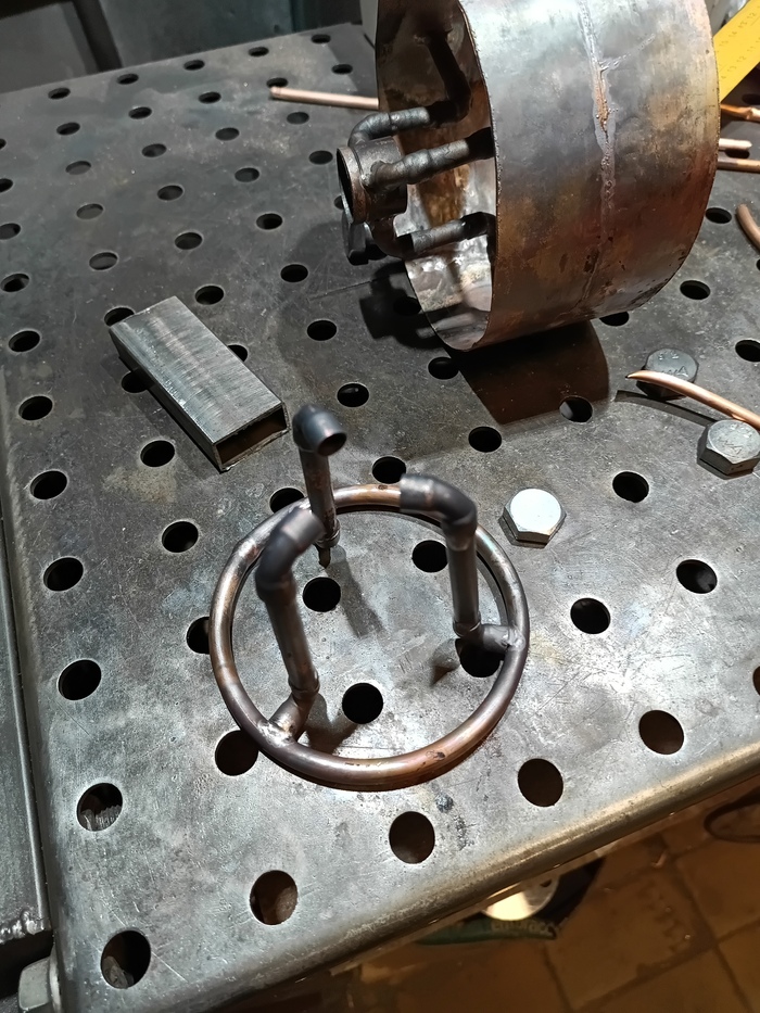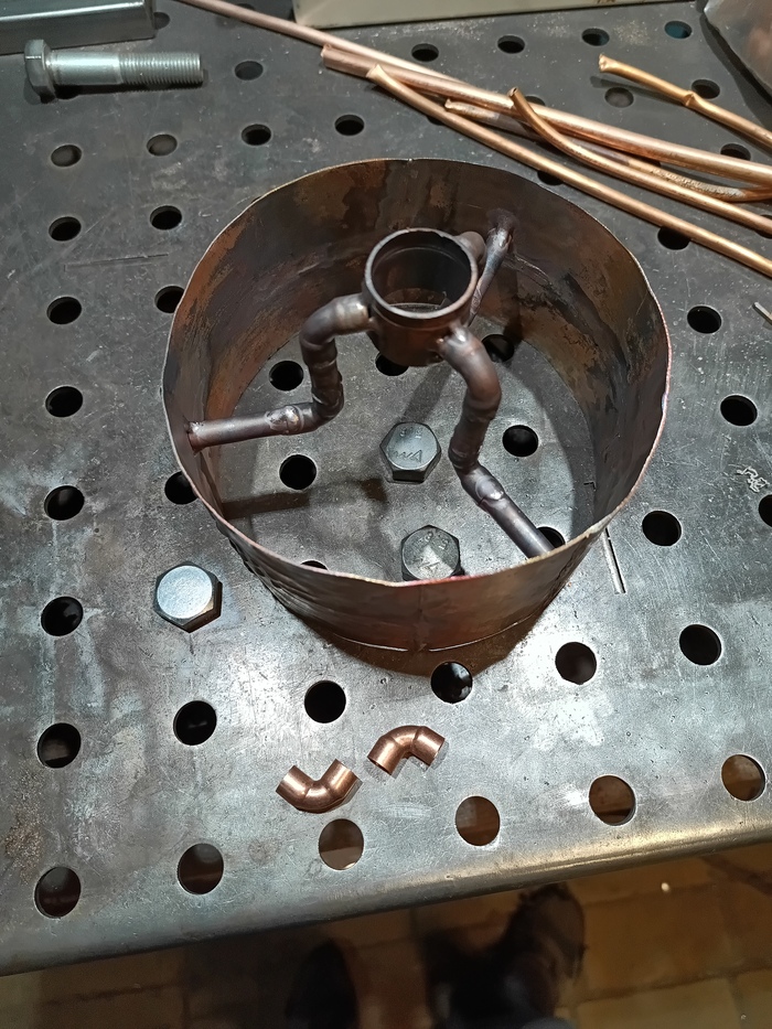 Затем наступила очередь крепления под патрон светильника. В качестве гильзы использовал кусочек медной трубы 1 1/8" (28,58 мм), гильзу прикрепил к кольцу тремя гусями из трубок и фитингов 3/8" (просто нравится трёхлучевая симметрия).