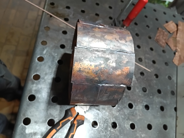Вид кольца был не особо интересным после пайки, не стал интереснее и после зачистки войлоком и придания ему характерного медного блеска. Решил "проклепать" все элементы кольца, для этого нанёс много-много капелек медно-серебряного припоя "пятёрки" по периметру каждой пластинки (припой Harris 5 5620F1/21113/21587, 5% содержания серебра, около 23000 рублей за кг).