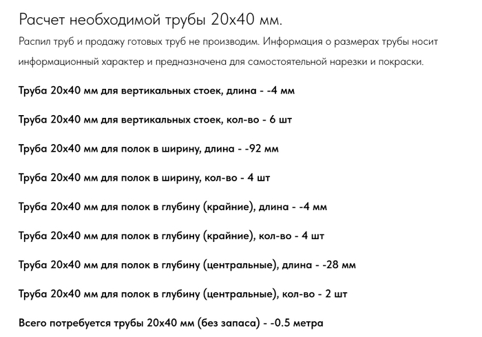 Так же калькулятор считает и размер трубы, которую надо напилить и их количество. Сделано для того, чтобы можно было заранее напилить нужные размеры, покрасить и затем за 10 минут, собрать все в единую конструкцию в домашних условиях.