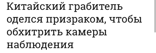В китайской провинции Фуцзянь грабитель оделся в костюм призрака, чтобы обхитрить камеры видеонаблюдения, сообщает Daily Mail. Мужчина накинул на себя штору, чтобы скрыть лицо, но, прежде чем облачиться в "костюм", успел засветиться на одной из камер.