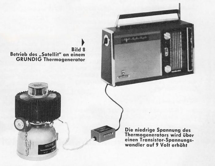 После войны термогенераторы использовали для электропитания домашних радиоприемников. В качестве источника тепла служила керосиновая лампа-самый распространенный источник света в домах тех времен. Даже фирма GRUNDIG долгое время комплектовала свои радиоприемники термогенератором.