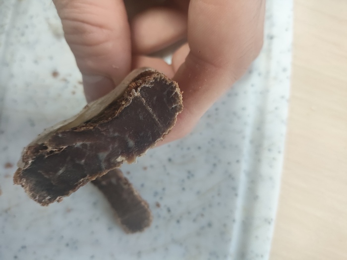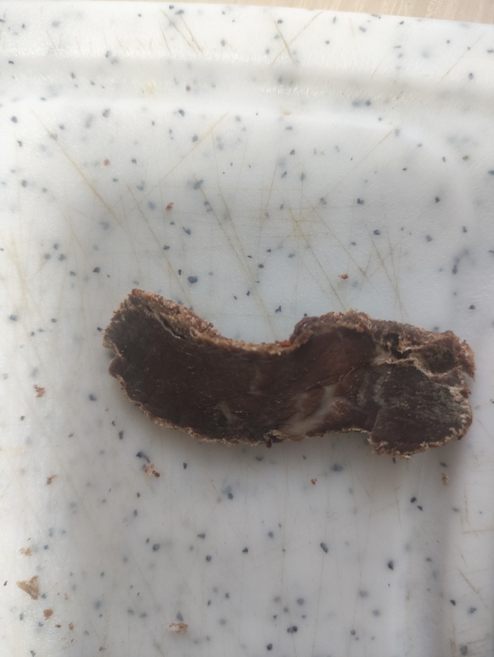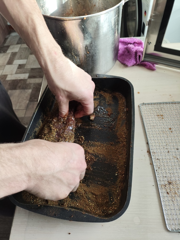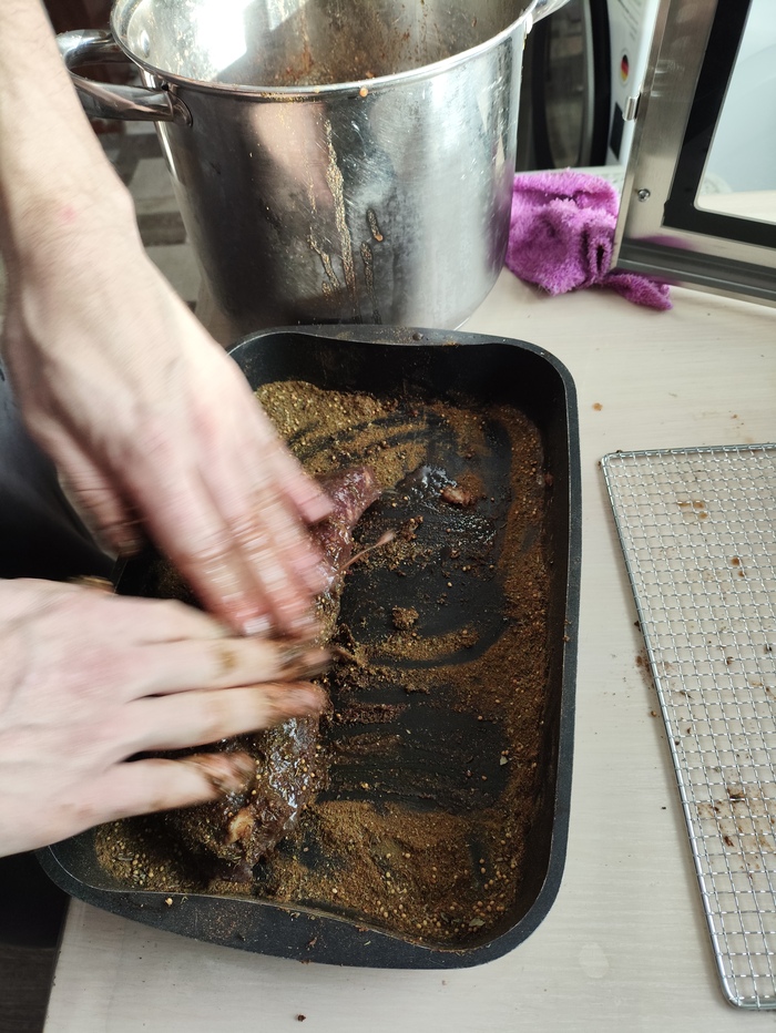 Дальше соль, перец, сахар и под пресс на три дня, потом давленный чеснок, перец красный кетчуп, паприку и ещё на сутки. Нитриты и красители в составе посолочных смесей я исключил.