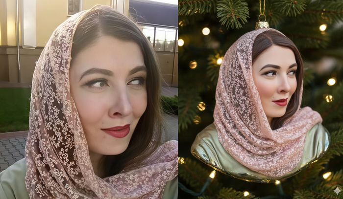 Возьми это фото и преврати в реалистичное ёлочное украшение из выдувного стекла, вдохновлённое загруженной фотографией. Это должна быть небольшая праздничная фигурка ручной работы. Соблюдай сходство с загруженным изображением. На елочной игрушке должен соблюдаться тот же стиль одежды, цвета, текстуры и материалы, что и на загруженном изображении, но естественным образом переносится в полноразмерную версию, сохраняя при этом целостность. У елочной игрушки должны быть глянцевые полимерные поверхности в сочетании с матовыми текстурами, нарисованными вручную, едва заметные несовершенства, реалистичная кожа, чёткие пропорции, отсутствие искажений. Максимально точно сохрани черты лица и его ракурс. Материал игрушки: прозрачное и цветное стекло, гладкое, глянцевое, с мягкими световыми искажениями и чёткими бликами. Важно: результат должен выглядеть именно как ручная стеклянная ёлочная игрушка, а не как человек в костюме. Елочная игрушка висит на тонкой золотой нитке среди натуральных зелёных елочных веток с тёплым праздничным золотистым боке. На ёлке уютно горит светящаяся гирлянда Уютная праздничная атмосфера, мягкое тёплое рассеянное освещение