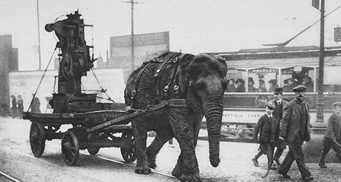 Слон, использующийся в качестве тягловой силы на складах боеприпасов в Шеффилде, Южный Йоркшир, (Англия) во время Первой мировой войны. На фото - перевозит какой-то станок. Февраль 1916 г.
