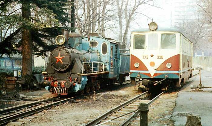 Паровоз 159-205 и тепловоз ТУ3-035 на станции "Пионери" детской железной дороги в Муштаиди. Грузинская ССР, 1982 год.