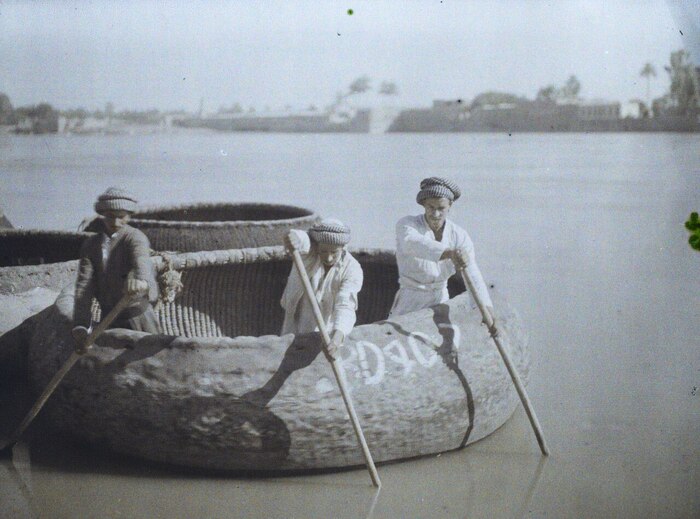 Мужчины на борту куффы (гуффы) на реке Тигр. Ирак, Багдад, 1927 год.