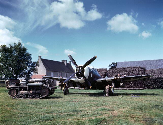 Техническое обслуживание американского истребителя P-47 Thunderbolt на импровизированном аэродроме во французской глубинке, лето 1944 года