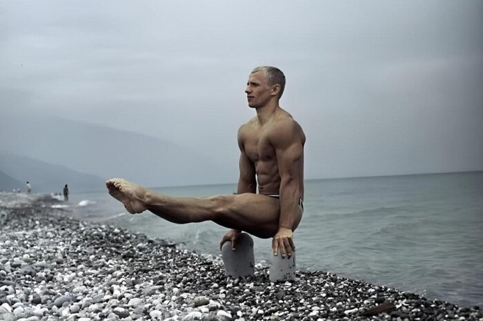 Советский гимнаст, дважды серебряный и бронзовый призёр Олимпийских игр - Сергей Диомидов на тренировке, СССР, 1968 г. В 1964 году первым в мире выполнил вертушку на 360 градусов плечом назад на пике маха вперёд, которая впоследствии была названа его именем.