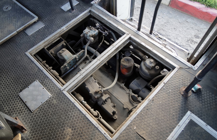 Мотор лежит горизонтально между передней и средней осями, повернут на 90 градусов. Благодаря такому расположению в салоне получился абсолютно ровный пол.