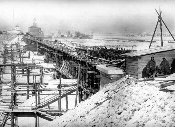 Вид с Рязанского берега реки Оки на строящийся Окский мост. 23 октября 1864 год.