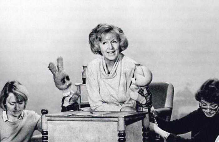 Ведущая телепередачи «Спокойной ночи, малыши!» Валентина Леонтьева со Степашкой (актриса Наталья Голубенцева) и Хрюшей (актриса Галина Марченко), 1985 год, Москва, СССР.