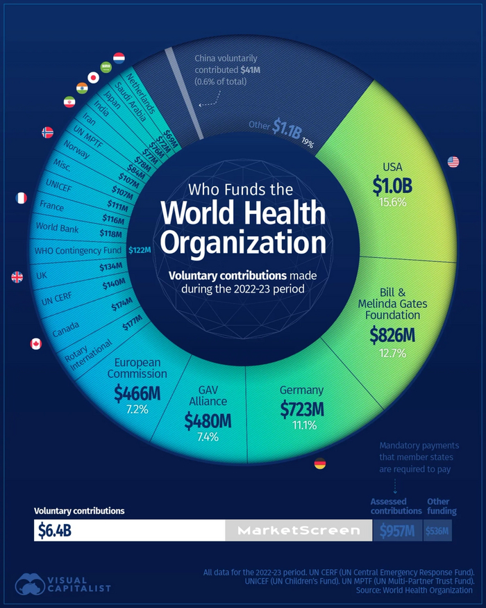 На основании бюджетных данных ВОЗ добровольные взносы Китая в 2022-23 гг. составили 41 млн долларов США, или 0,6 % от общего объема добровольного финансирования. Как видно на этом графике, эта сумма меркнет по сравнению с 1 млрд долларов, предоставленных США.
