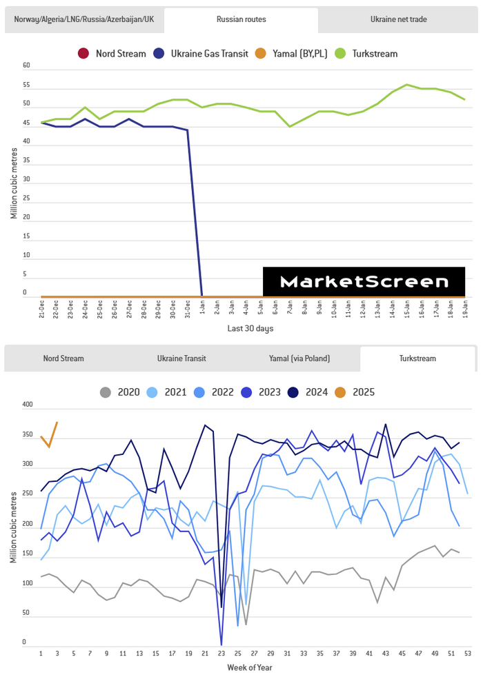 Ну это ладно. А вот объемы по «Турецкому потоку» достигли на позапрошлой неделе исторических максимумов. 378 млн.куб.м. Предыдущий рекорд был поставлен в прошлом году – 375 млн.куб.м. По Украине в прошлом году проходило что-то в диапазоне 300-320 млн.куб.м.