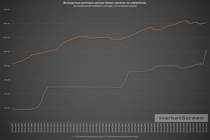 А теперь смотрите. Оранжевая – это долг с фиксированными процентами. Да, еще момент, тут даны сведения с учётом погашений. Так вот, оранжевый – это долг с фиксированными процентами/выплатами. По номиналу. За последние три года он не сильно увеличился. И он государству удобен, если размещался в момент низких процентных ставок. При этом долг с переменными процентами, который размещался в период высоких процентных ставок (синий), а мы видим, что он удвоился за последние пару лет, будет выгоден государству потом, когда ставки упадут.