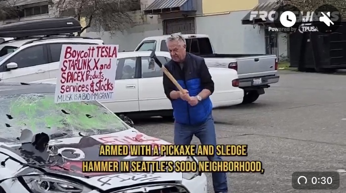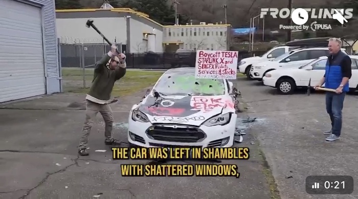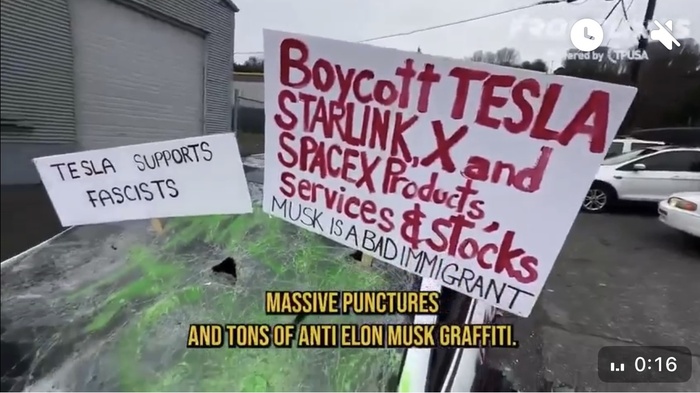 Помимо этого, леворадикал высказался заявлениями, что Маск — «плохой иммигрант», а Tesla «поддерживает фашистов» (на плакатах).
