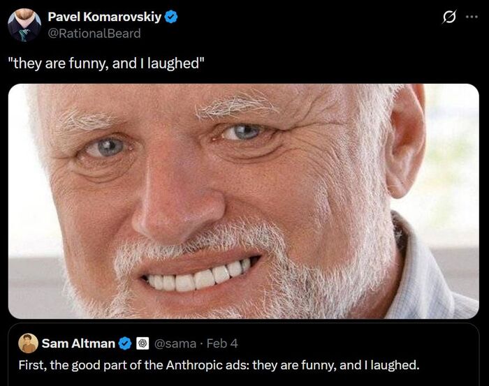 Сэм Альтман выкатил большой ответ – там он написал, что реклама получилась действительно забавной, но отметил, что реклама в ChatGPT не встроена в ответы, а показывается отдельно. Также он сказал, что Claude от Anthropic работает в нише продукта для богатых, тогда как OpenAI стремится предоставить доступ к AI для всех людей (ради чего и приходится идти на жертвы вроде добавления рекламы). Вердикт твиттерских был такой: «лол, у Альтмана реально бомбануло!».