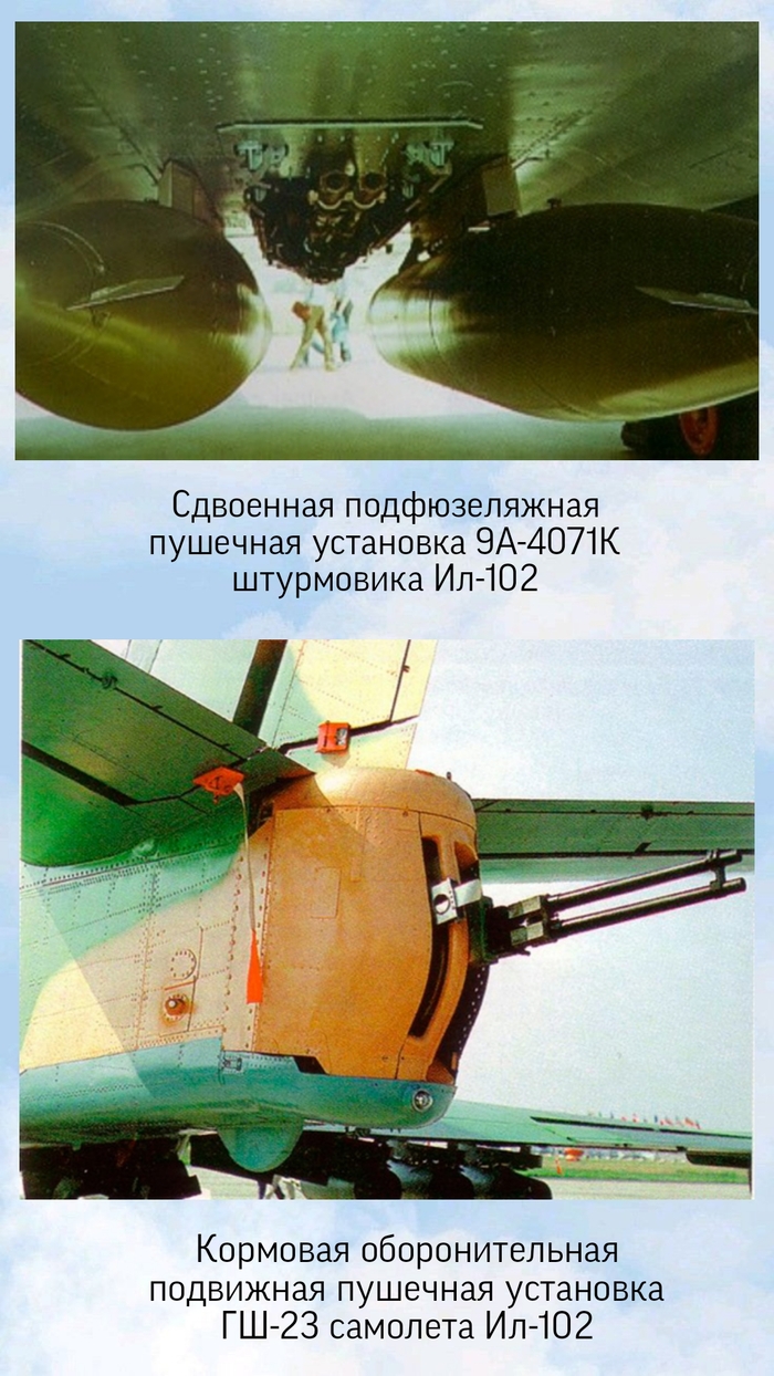 В нижней части фюзеляжа на качающемся подфюзеляжном лафете, который фиксировался в двух положениях, была установлена спаренная 30-мм пушка 9А-4071К, боекомплект которой состоял из 500 снарядов. При сопоставимой с Су-25 огневой мощи артиллерийская установка на Ил-102 отличалась тем, что была управляемой. Она могла отклоняться вниз на угол до 15 градусов. Помимо этого было реализовано еще одно интересное решение — при желании всю пушечную установку можно было легко снять и подвесить вместо нее дополнительный топливный бак или две бомбы, добавив еще два узла внутренней подвески и доведя их общее число до 16. 30-мм артиллерийская установка могла быть легко демонтирована в течение нескольких минут прямо на аэродроме.